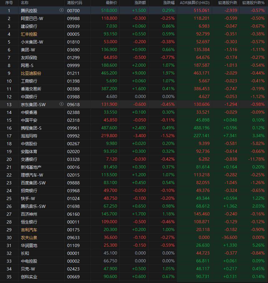 大型蓝筹股涨跌互现,汇丰控股收报92.799港元,较香港收市跌0.38%;腾讯控股收报515.061港元,较香港收市跌0.57%。