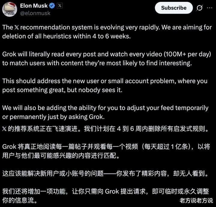 但随着马斯克把算法开源,就可能颠覆社交媒体的竞争逻辑,而对内容创作者来说,“粉丝量”的权重就大幅度削减了。
