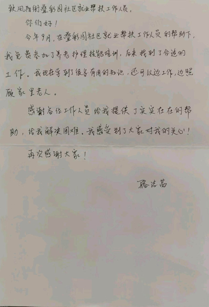 “今年9月17日,我参加了凤阳街道叠彩园社区举办的养老护理员技能培训,感谢社区就业工作人员给我提供了实实在在的帮助,我现在学到了很多有用的知识,还可以边工作,边照顾家里老人。”近日,凤阳街道叠彩园社区居民洛洁茜,写信感谢社区在就业方面给予帮助。