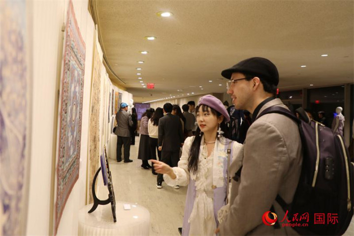 当地时间12月8日晚,“敦耀光华:清华大学美术学院敦煌艺术研究及设计成果展”在纽约联合国总部举行开幕仪式。图为观众正在观看展览。人民网记者李志伟摄